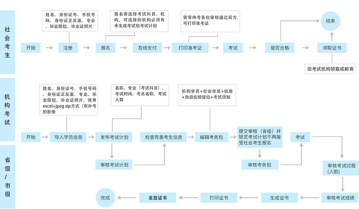 智慧考試系統(tǒng)主要是由考生端、考試端、機構端、監(jiān)管端、管理端等組成,對線上考試進行綜合管理的系統(tǒng)平臺。該平臺將考生培訓、報名、繳費、考試安排、考務管理等考試流程信息統(tǒng)一管理,并從各個維度幫助企業(yè)立體化分析考生考試等數(shù)據(jù),極大提升了考試流程的規(guī)范化、標準化、信息化,提升了考試效率,提升了考生的考試體驗。